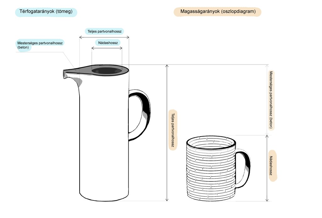 Amilyen arányban található mesterséges partszakasz az adott település teljes partszakaszának hosszában, olyan arányban öntöttem betont a kancsóba úgy, hogy ezek az arányok felülről is láthatóak, ezért a forma egyfajta hengerpalást, egy változó falvastagságú “gyűrű”.