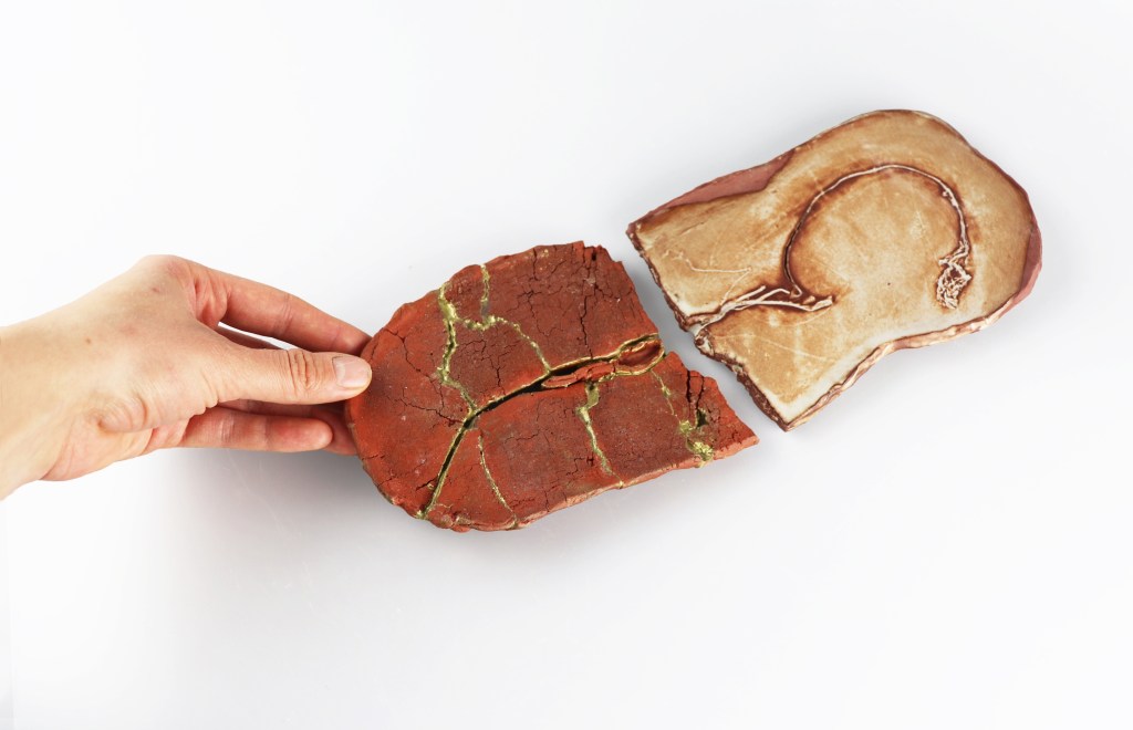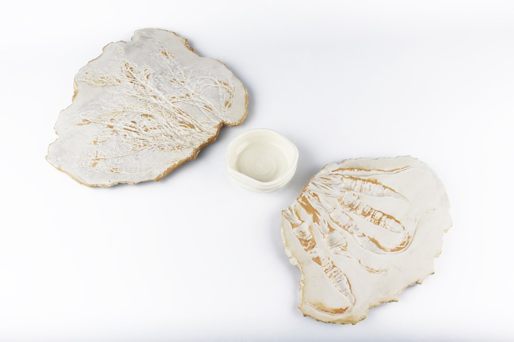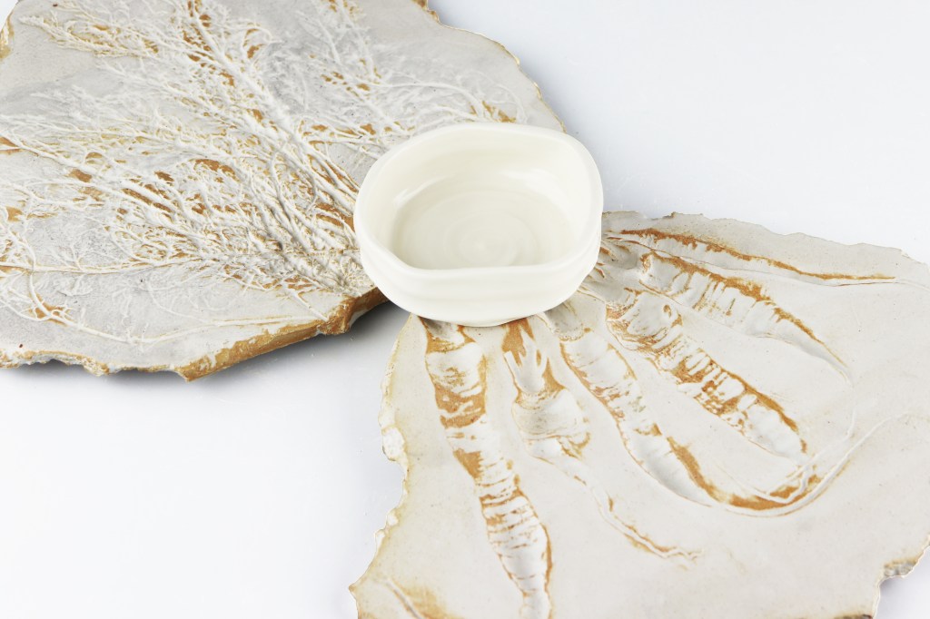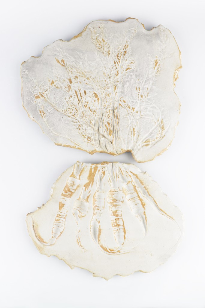 Through Kati Réthy, the founder and head gardener of the Szezon Kert, I used freshly picked root vegetables to create prints on ceramic trays, which the supermarket shopper would not see in this form. It is not only the size of the green of the carrot, beet or radish relative to the root that is interesting (although in organic garden conditions the root does not really ‘grow’ as large as its over-medicated counterpart), but also the shape and form of the roots themselves. I then cut the trays into two or three pieces in a puzzle-like way, at the very points of the impression where some of the otherwise edible parts of the vegetables are usually cut off. By fitting the elements of the tray, the parts of the vegetable that do not fit in our memories can be put together, reinforcing the importance of parts previously considered waste not only for our human lives, but for the ecosystem as a whole.