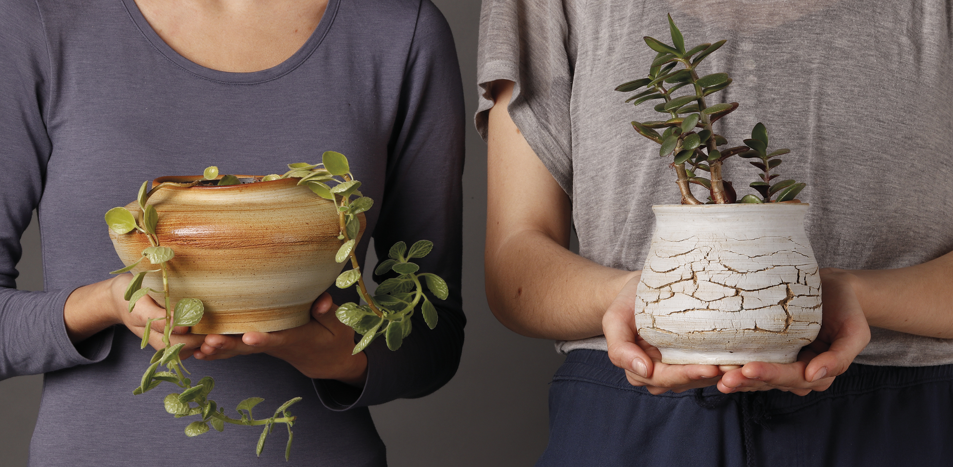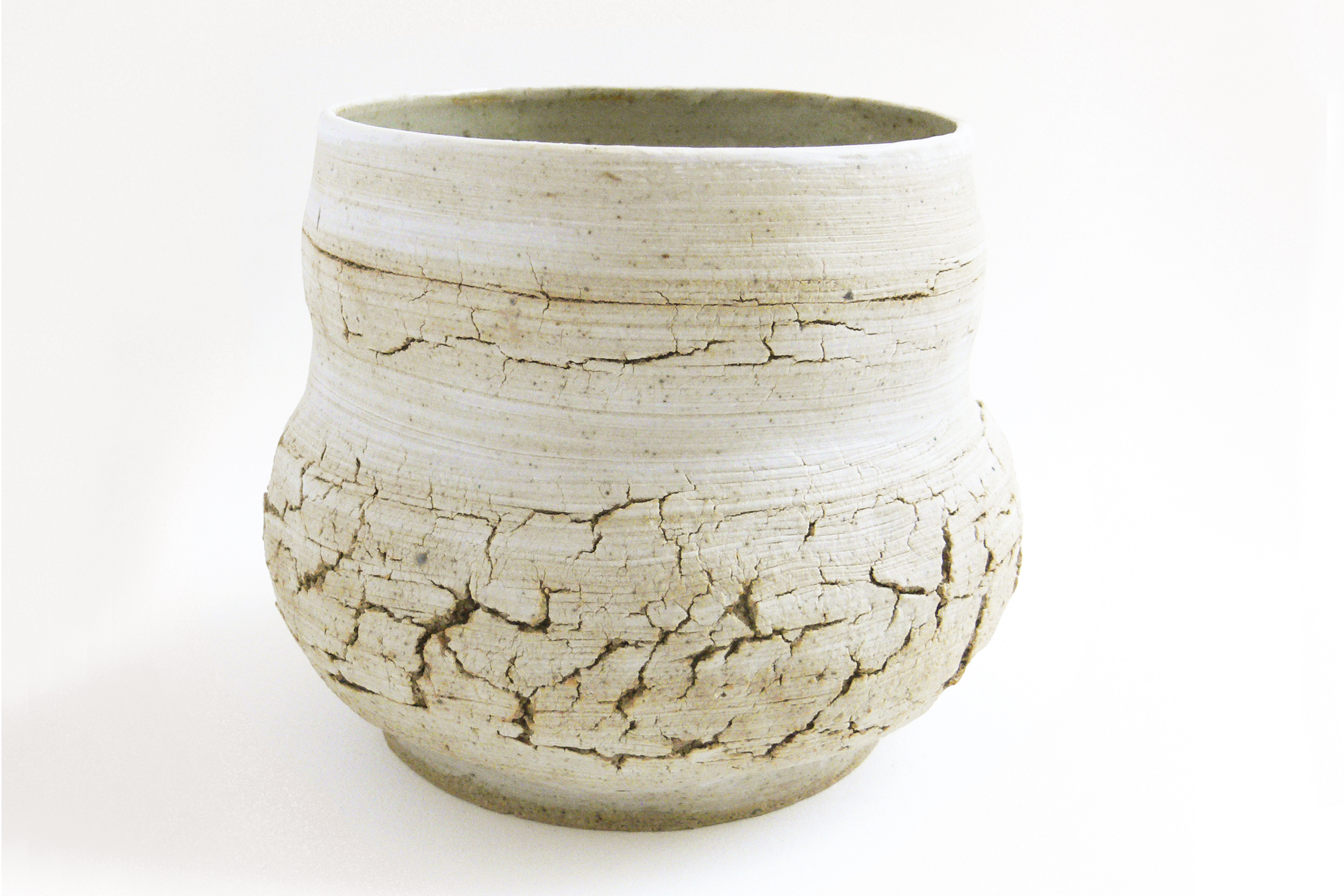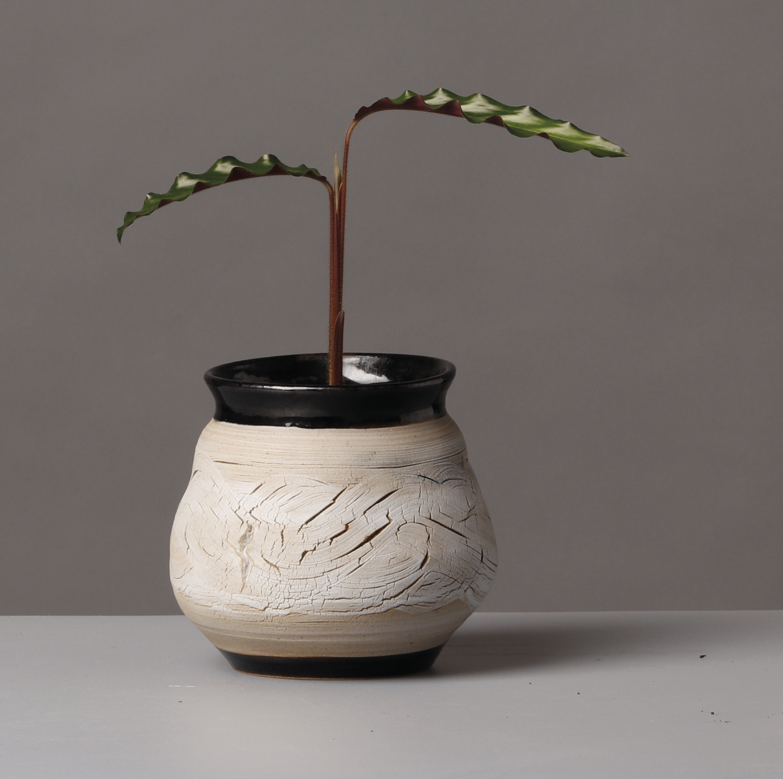 The POETTERY experimental series aims to show an organic relationship between shape and surface of usable ceramic plant pots. Each piece was thrown and deformed on the potter’s wheel, leaving a trace on the outside surface. Cracked and crushed textures make the shaping effects visible, but in interaction with plants, they can also be perceived as a force exerted by the roots. Thus the plant and the object, living and inanimate material forms a natural unit.